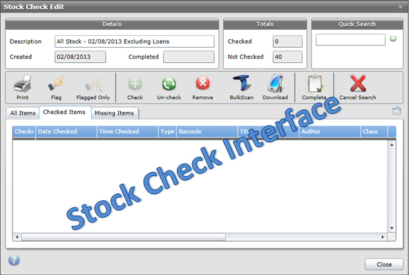 ·The stock check interface will now open where books can be checked/unchecked. Click here for more information about using the stock check interface.