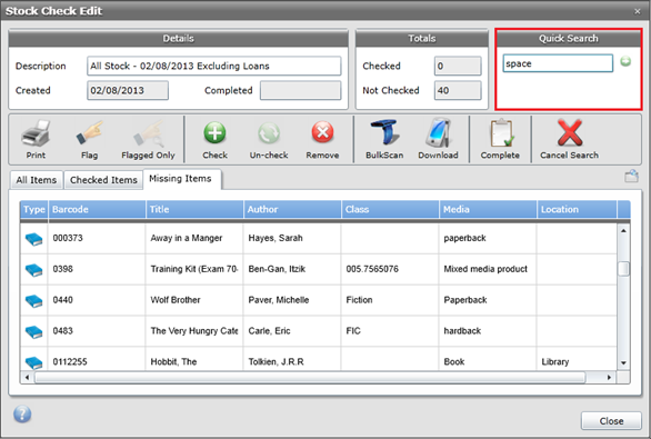 It is possible to search for specific resources during the stock taking session by using the Quick Search function. Note that the Quick Search only searches the selected tab (All Items, Checked Items or Missing). For example, if searching when Missing Items is selected then only results from that tab will be returned. When All Items is in view, resources from both Checked Items and Missing Items are returned.